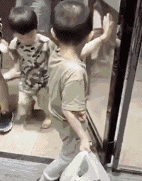 一个小男孩,看见有阿姨带着孩子要进门,于是他赶紧跑过去。