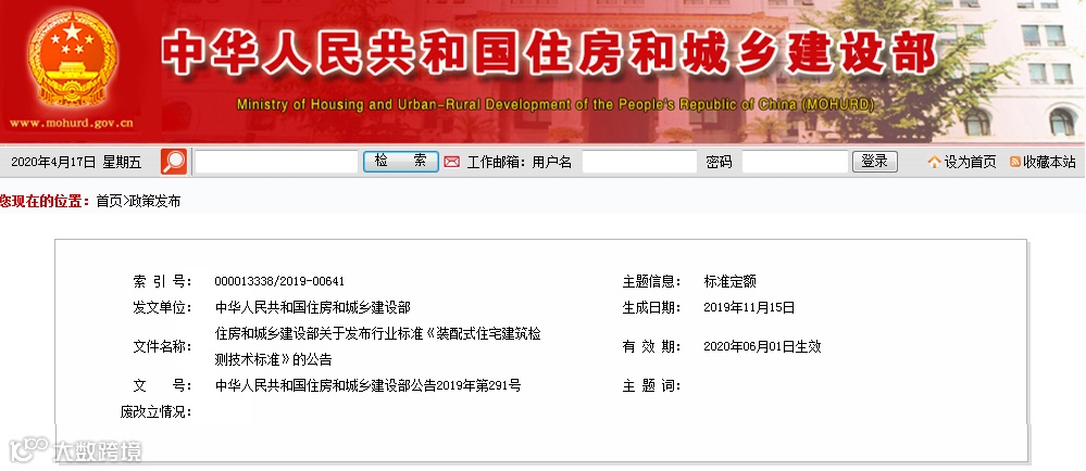住房和城乡建设部官网消息,现批准《装配式住宅建筑检测技术标准》为行业标准,编号为JGJ/T485-2019,自2020年6月1日起实施。