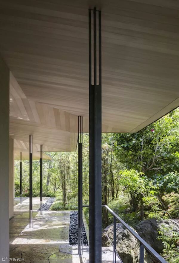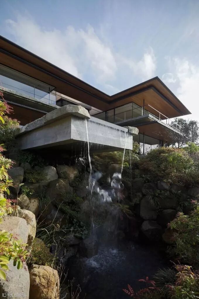 以质朴山石+混凝土打造的水景露台,形成了向外伸出的小型瀑布,将建筑与自然景观相结合,展现出纯粹的山水之美