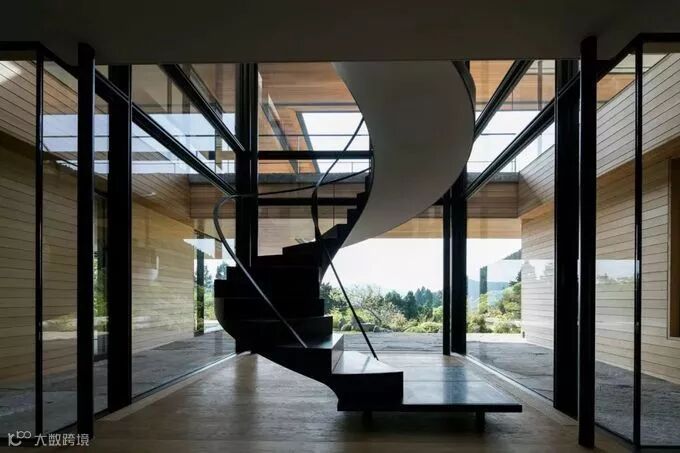 挑空设计的室内庭院光线充足,中间有一架旋转楼梯通往二楼,外观具有雕塑感,兼具功能与装饰性。