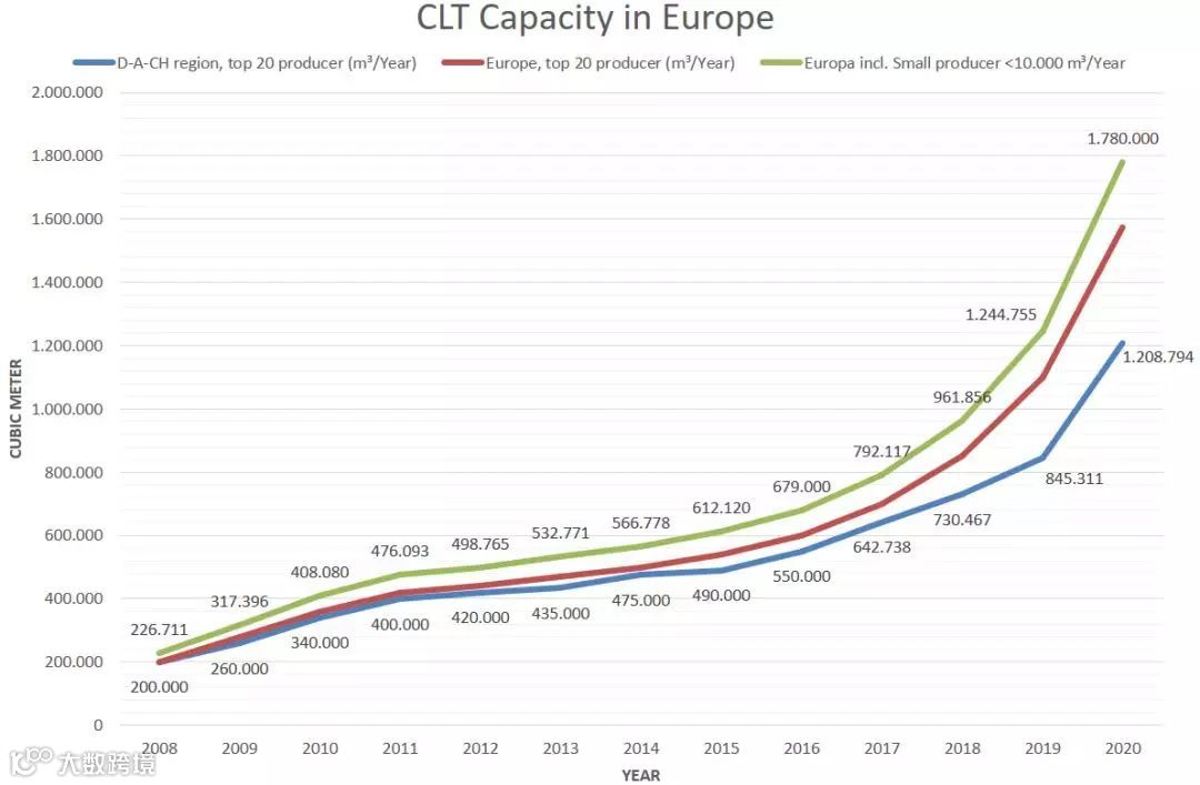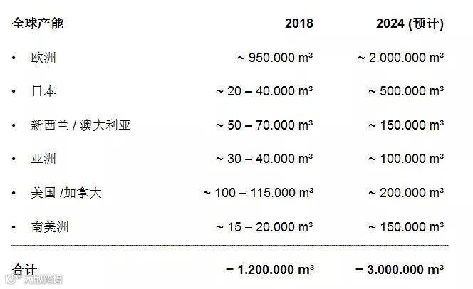2018年欧洲CLT的产量大约95万m³,每年以大约15%的速率增长。以此推算,到2024年,欧洲CLT的产量将突破200万m³/年。