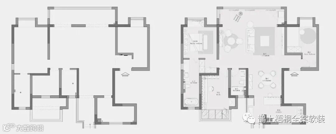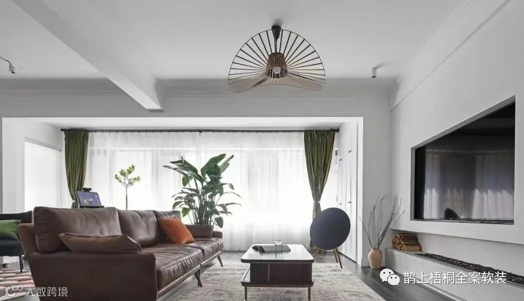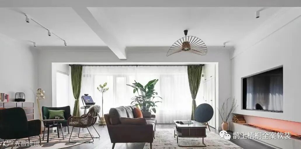 大横厅+景观阳台的布局注定让这个套案例大放异彩,阳台纳入了客厅空间,增加室内的自然采光,让空间更加明朗,左边规划了个小茶厅,右边则沙发电视角。整个屋内运用了现代主义美学并融入了一些轻复古的元素,将原本单调的屋内点缀的情调满满,舒适宜居。