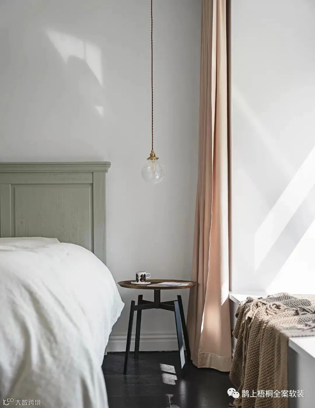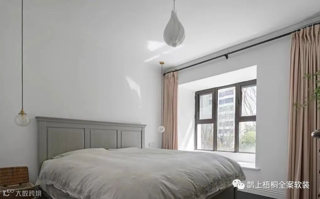 主卧是洁白简约的背景墙,两盏吊线灯+中间一盏吊灯构成了主卧的灯光世界。
