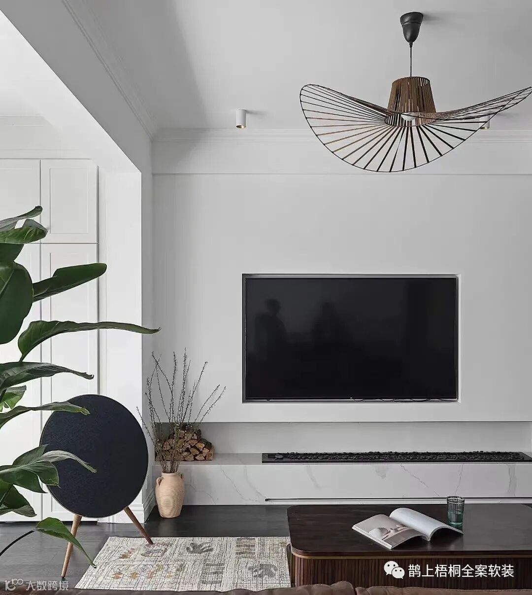 嵌入式的电视,让整个墙面看上去简约又干净,地台式的电视柜还加上了假壁炉,好看也不容易过时。搭配上方的两盏射灯,晚上看过去非常有氛围。