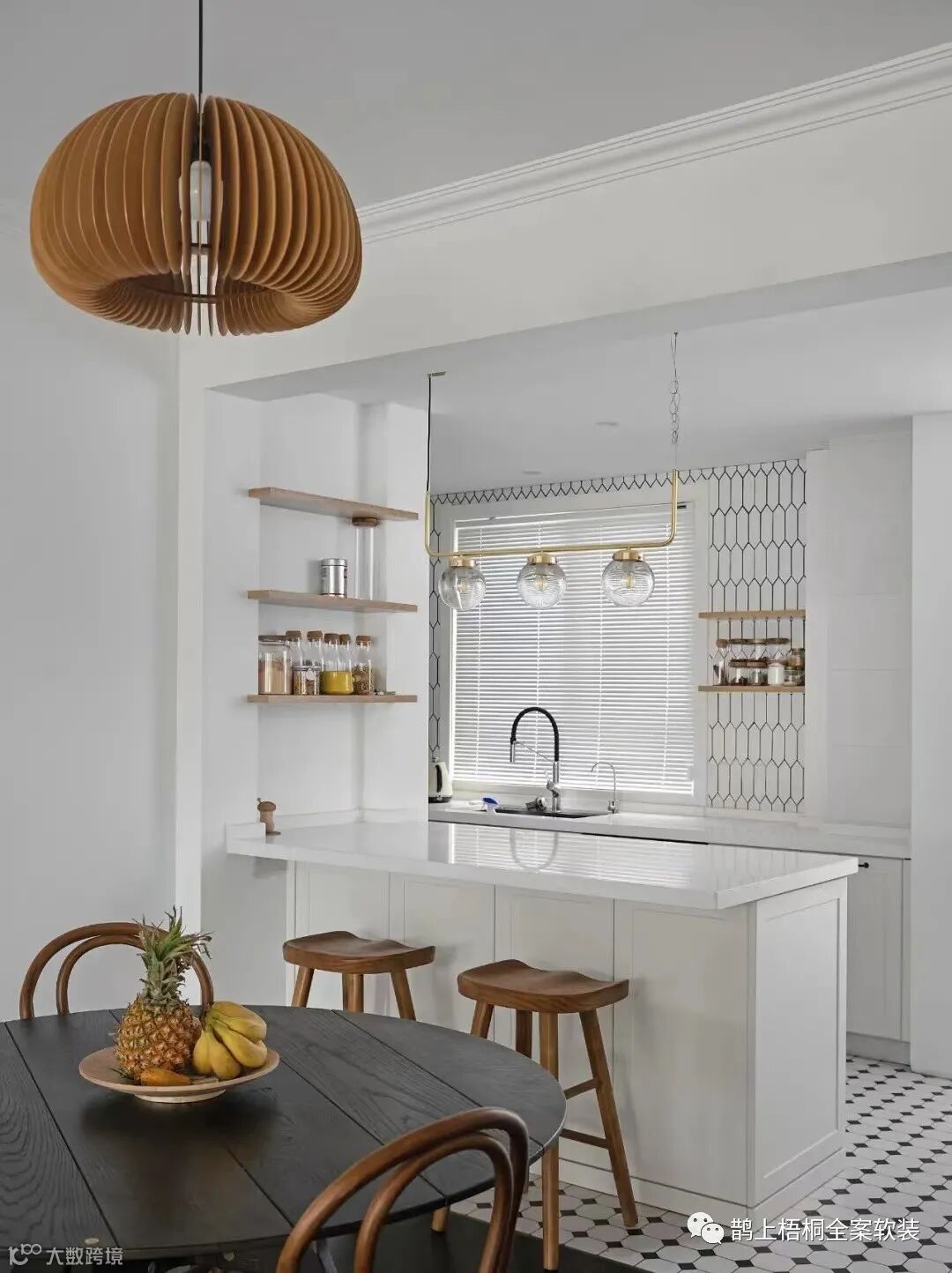 餐厅旁边是开放式的厨房,中间是吧台,买台咖啡机,面包机,秒变西厨。