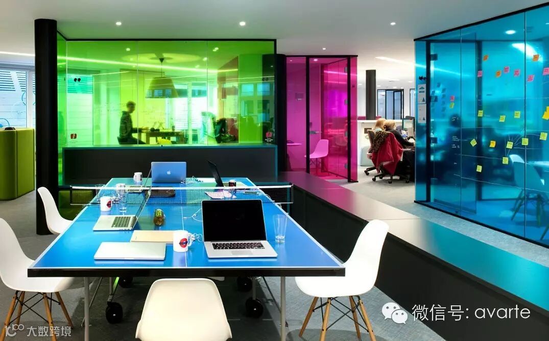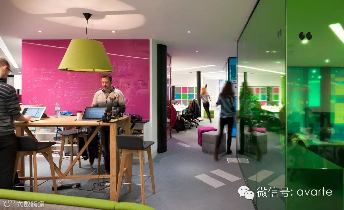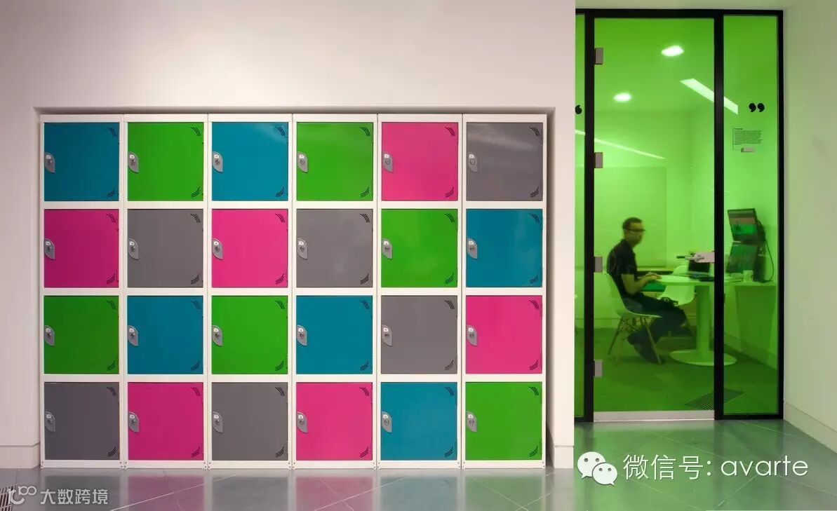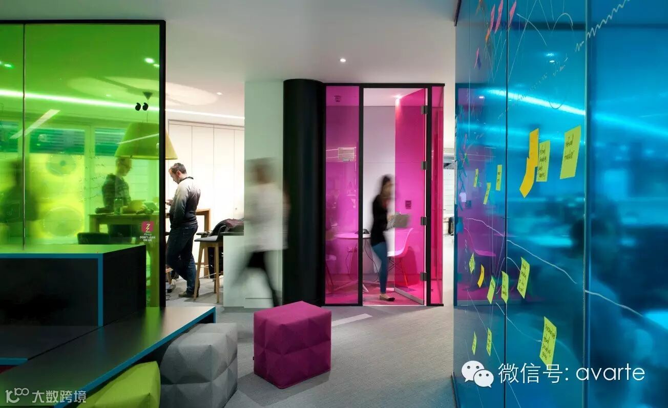 米歇尔还把很多鲜艳的颜色和线条应用在玻璃、墙面、储存柜、地毯、凳子和坐垫上,作为公司文化的一部分,员工们也把五彩的便签纸贴在玻璃墙上,与整个环境相互呼应。