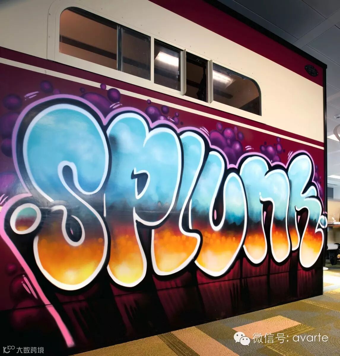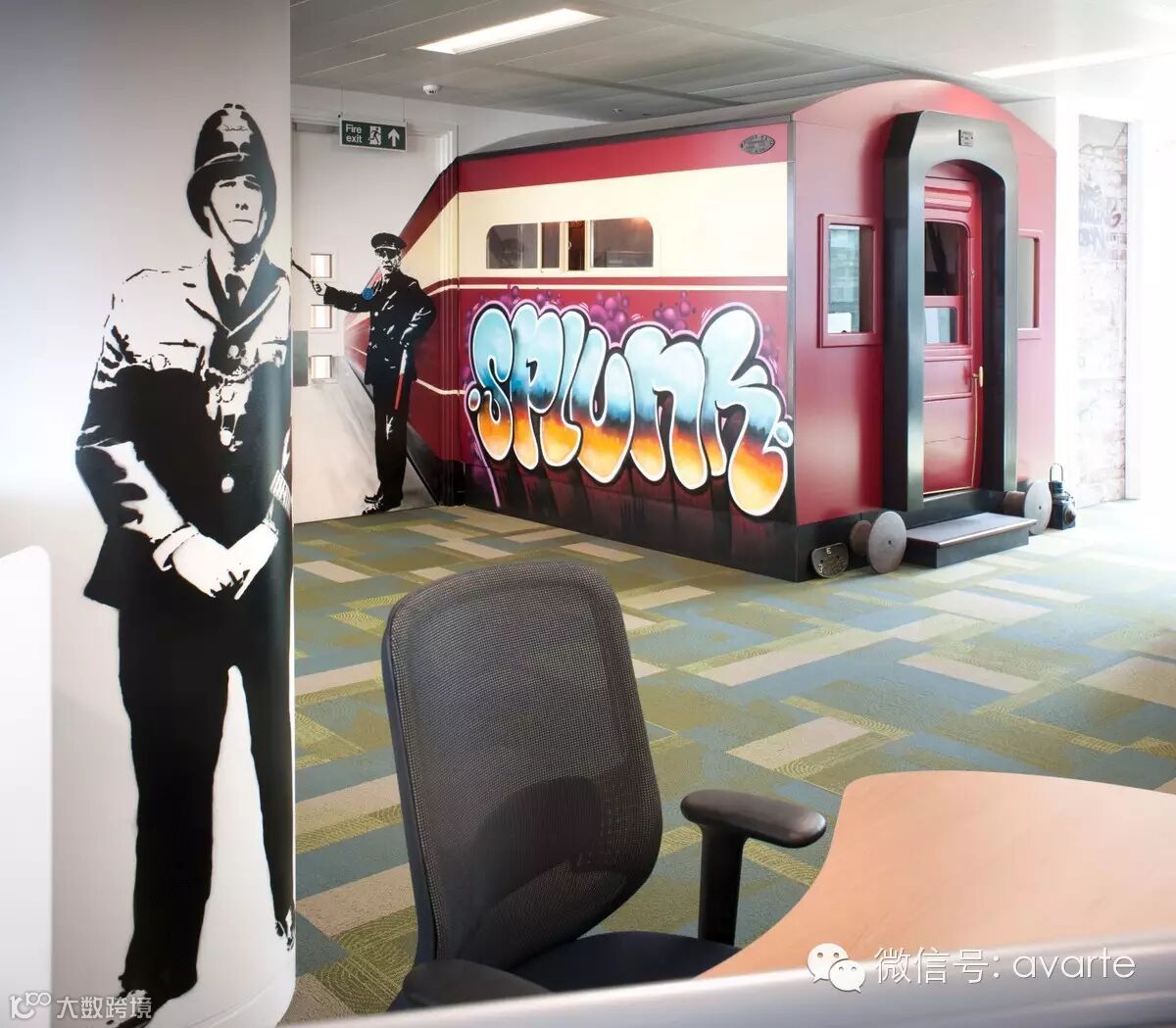 Splunk是这样一间办公室,它坐落在一栋现代的玻璃钢筋建筑里,但当你走进它的时候,却发现好像走在东伦敦的某条小街上。警察、油漆工、修路工甚至《神秘博士》(Doctor Who)里的时光机......班克斯(Banksy,英国著名的街头涂鸦画家)风格的涂鸦遍布“红砖墙”和“铁皮门”上。跟着地铁标志往里走,还能找到一节火车车厢,这是以前从帕丁顿(Paddington)火车站开出的一种老式火车车厢。