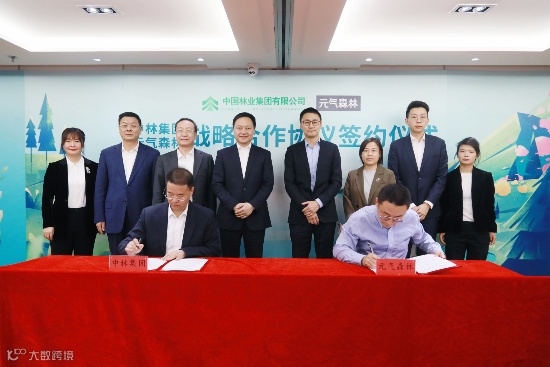 4月14日,元气森林与中国林业集团有限公司(简称“中林集团”)在京签署战略合作协议。中林集团公司党委书记、董事长余红辉,元气森林创始人唐彬森出席会议并见证签约。