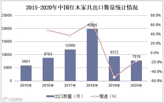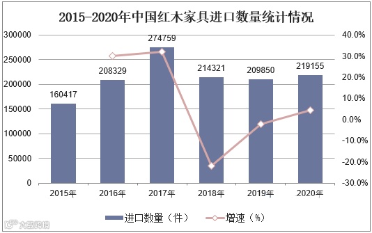 根据中国海关数据显示,2019年中国红木家具进口数量为209850件,2020年中国红木家具进口数量为219155件,2020年相对于2019年上升了4.4%。