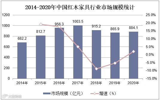 但受国际公约限制、国家政策改革及木材价格波动影响,2018年红木家具市场价格走高,致使市场需求量显著下降,到2019年市场规模下降至865.9亿元,2020年红木家具行业市场需求有所回升,市场规模上升至884.1亿元。