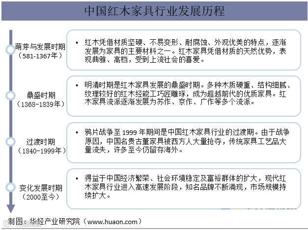 中国红木家具行业的发展始于隋唐时期,行业经历约1500年的发展,具有深厚的历史积淀和传统文化内涵,其发展历程可分为四个时期。