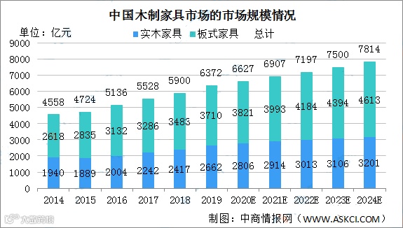 随着中国稳定的宏观经济环境持续增长的收益,中国木业家具市场规模稳步增长。2019年中国木业家具市场规模6372亿元。预计2024年市场规模将达到7814亿元。