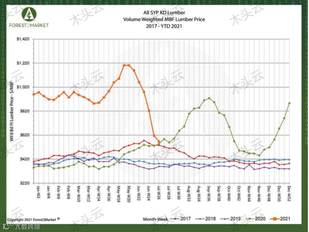 原木储存过剩加上工厂效率的提高使原木价格受到抑制,一直在400美元的区间徘徊。即使今年消费市场对木材的需求激增,导致木材的价格一度达到常态价格的4倍。但随着市场的热度减少,木材价格在几周内快速下降,甚至出现了低于常态的价格。