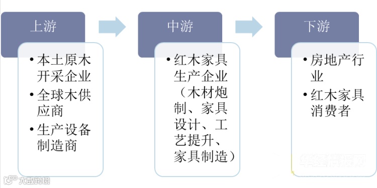 中国红木家具行业产业链上游主体为本土原木开采企业、全球红木材料供应商及家具生产设备制造商。中游的主要参与者为红木家具生产企业,负责红木家具的设计、制造及销售。下游则涉及房地产行业及终端消费者。