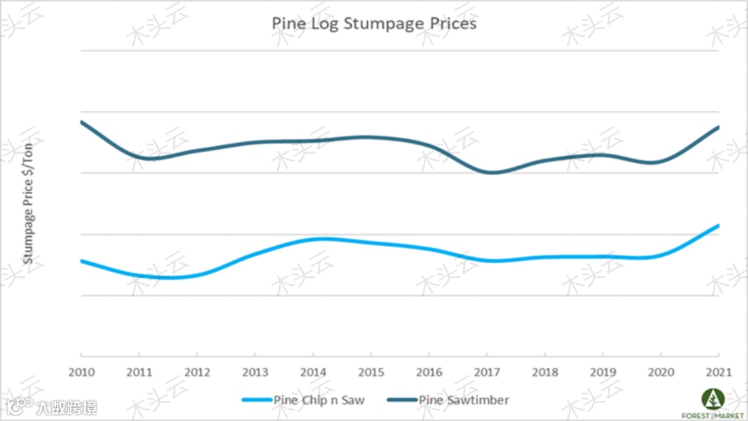 过去 12 个月木材的价格跳动远非“正常”,但木材需求强劲,松木产品(锯材和 CNS)价格飙升。根据 Forest2Market 的Stumpage 360数据库,南部地区年初至今的松木原木价格比 2020 年上涨了 11%,现在已创下 10年新高。