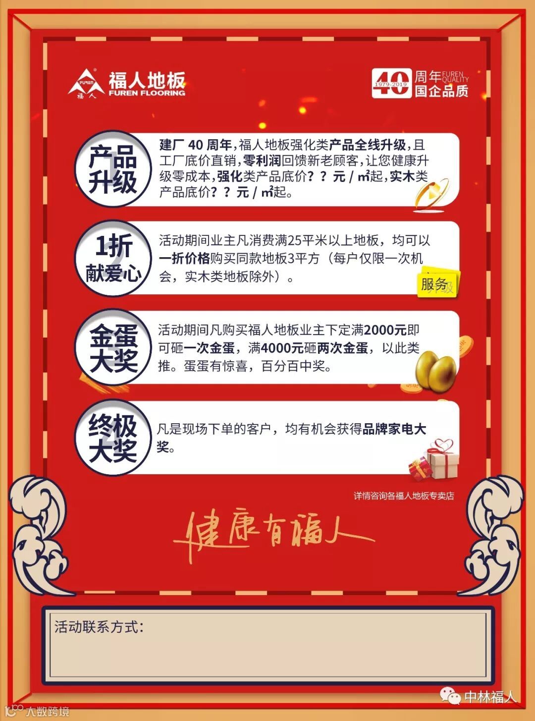 建厂40周年,福人地板强化类产品全线升级,且工厂底价直销,零利润回馈新老顾客,让您健康升级零成本,强化类产品底价??元/㎡起,实木类产品底价??元/㎡起。
