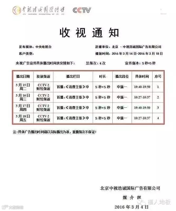 福人地板3.15央视广告投放