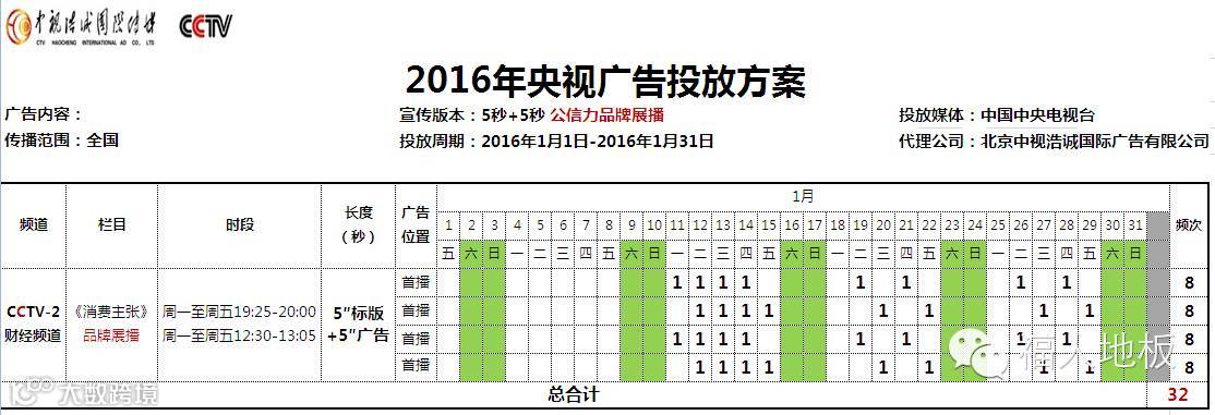 2016年1月福人地板央视投放时间表