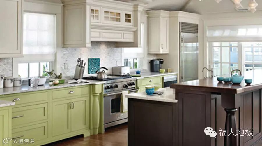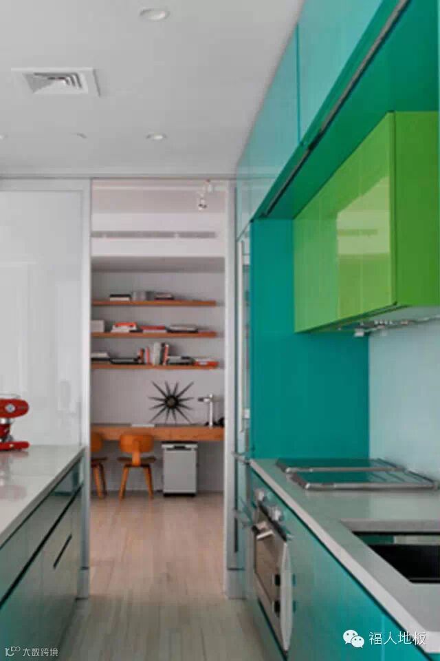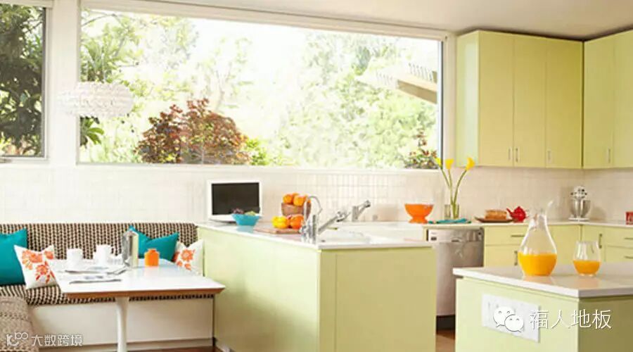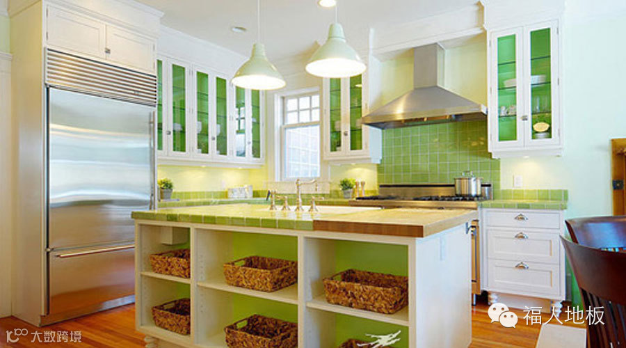 绿色调是轻松舒爽、赏心悦目的颜色,看起来既清新又干净,就像这款厨房,用颜色来点燃艺术的氛围,白色调搭配果绿色,再铺上暖色的木地板,无论是白天阳光照射进来,还是夜晚柔和的灯光,让这些色彩都富有生命力,在这里烹饪,情感与美食都会美美融合。