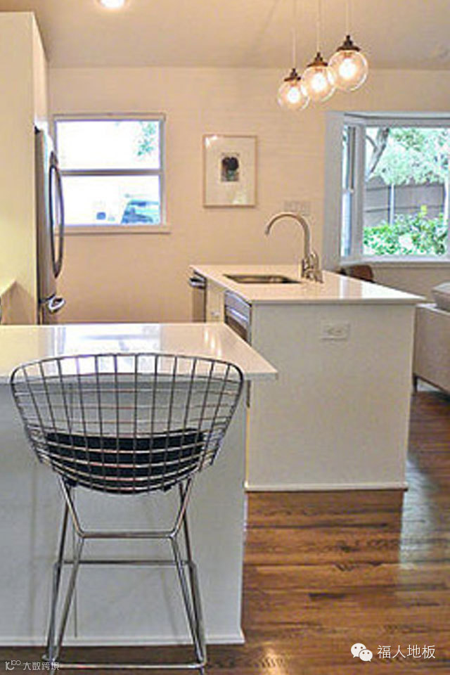 开放式厨房里的早餐吧最好是设计在窗户旁,能够获得充足的自然光线,营造良好的用餐氛围。在这间开放式厨房里,大面积的开窗设计和清爽的绿色橱柜,都让早餐吧更加明亮。地面铺装的实木复合地板更为这间厨房增添了温馨感。