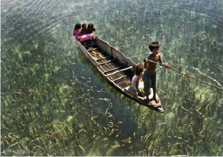 划舟的孩子好像是在天空中游荡