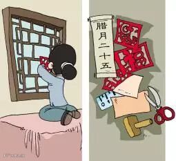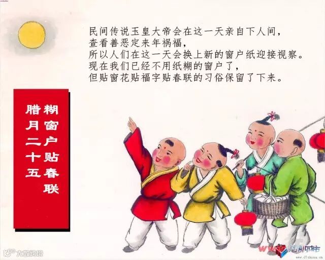 在窗户纸上贴春联、福字、窗花和刻有吉祥图案的剪纸。民间传说玉皇大帝会在这一天亲自下人间查看善恶定来年祸福,所以人们在这一天会换上新的窗户纸迎接视察。现在我们已经不用纸糊的窗户了,但贴窗花贴福字贴春联的习俗保留了下来。
