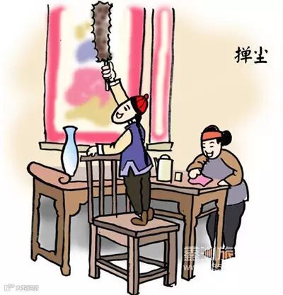古代把春节大扫除称为“扫年”“掸尘”,起源于古代人民驱除病疫的一种宗教仪式,后来逐渐演变为年终的卫生大扫除。对于北方来说,严冬中的腊月扫房,只是掸扫而已,而在南方往往将桌椅板凳,甚至大架子床都抬到河边、井边去刷洗。据《吕氏春秋》记载,我国在尧舜时代就有春节扫尘的风俗。按民间的说法:因“尘”与“陈”谐音,新春扫尘有“除陈布新”的涵义,其用意是要把一切“穷运”、“晦气”统统扫出门。