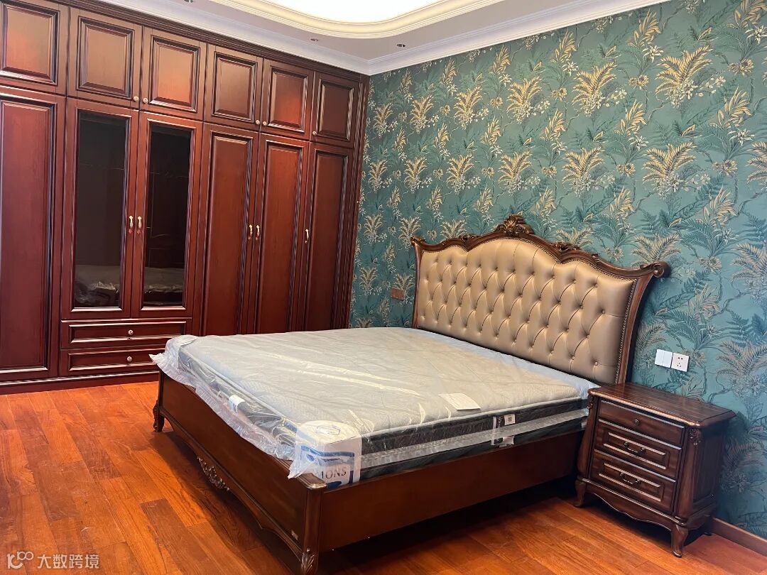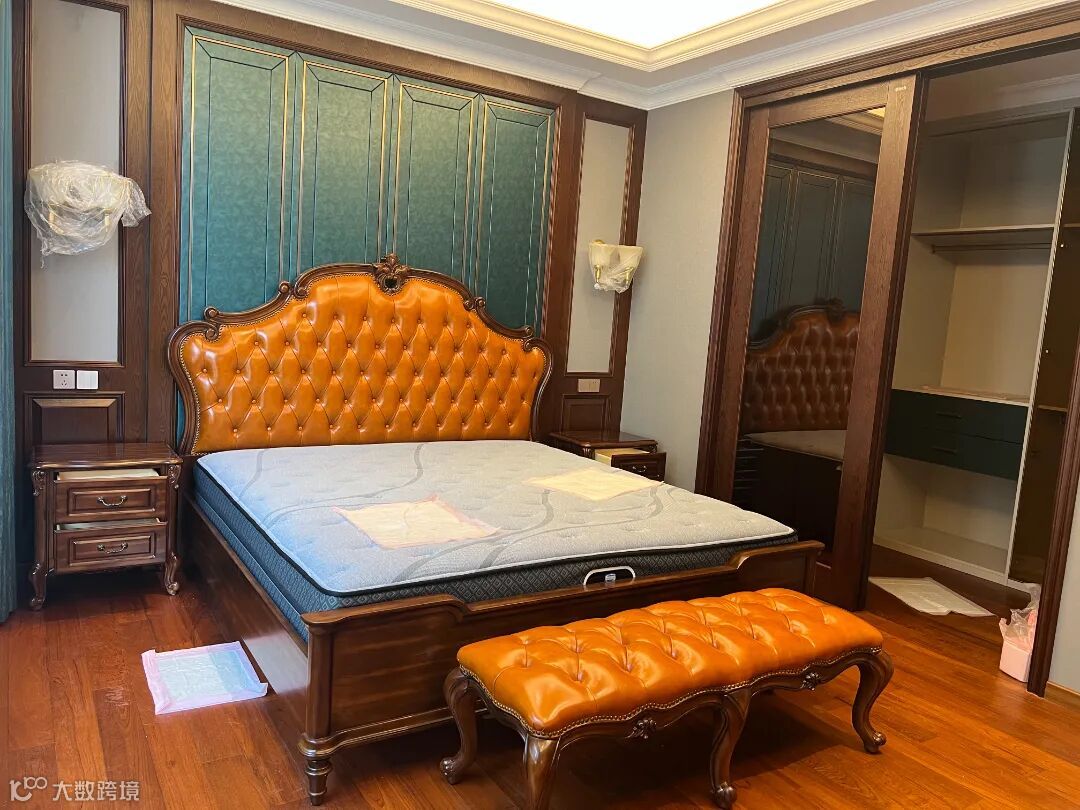 卧室延续了客厅、餐厅的主色调。主卧大面积采用暖色调,深暖色+浅暖色的组合,让整个卧室更有温馨感。温润稳重的深色实木床,其典雅的设计与精湛的工艺,融汇着古典与现代的魅力,让人沉醉其中;柔软细腻的真皮软包靠背,触感舒适,贴合体形,为疲惫的身体带来温暖的拥抱,为灵魂提供了一片宁静的港湾。