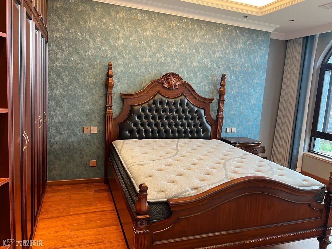 次卧的床头墙面采用浅色墙纸包裹,搭配深色复古的家具,依旧是实木+真皮软包靠背的大床,打造出温馨的睡眠空间。左边床头放置一张床头柜,不对称地放置,勾勒出时尚复古的品质感。