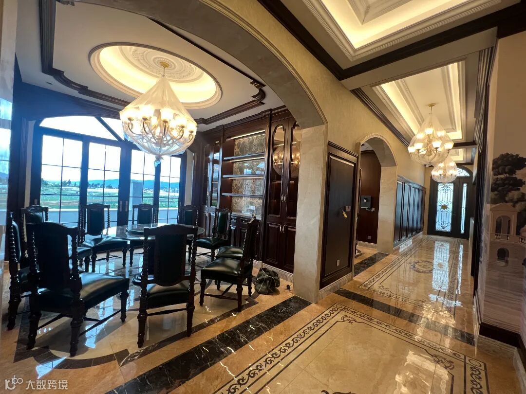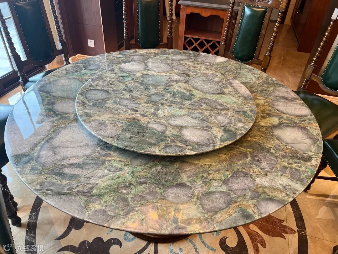 祖母绿奢石餐桌,则是本案的餐厅一大亮点。产自巴西的祖母绿奢石,浑然天成的生机翠绿,自然纹理丰富、色泽浓郁不一且晶莹剔透的晶体,高级感十足。同时,每一块这样的石材都是全世界独一无二的,尽显奢华又极具艺术气息,目光所及之处皆是光闪熠熠,为您的用餐时光增添不少的仪式感,让每一餐都成为一场令人心动的体验。