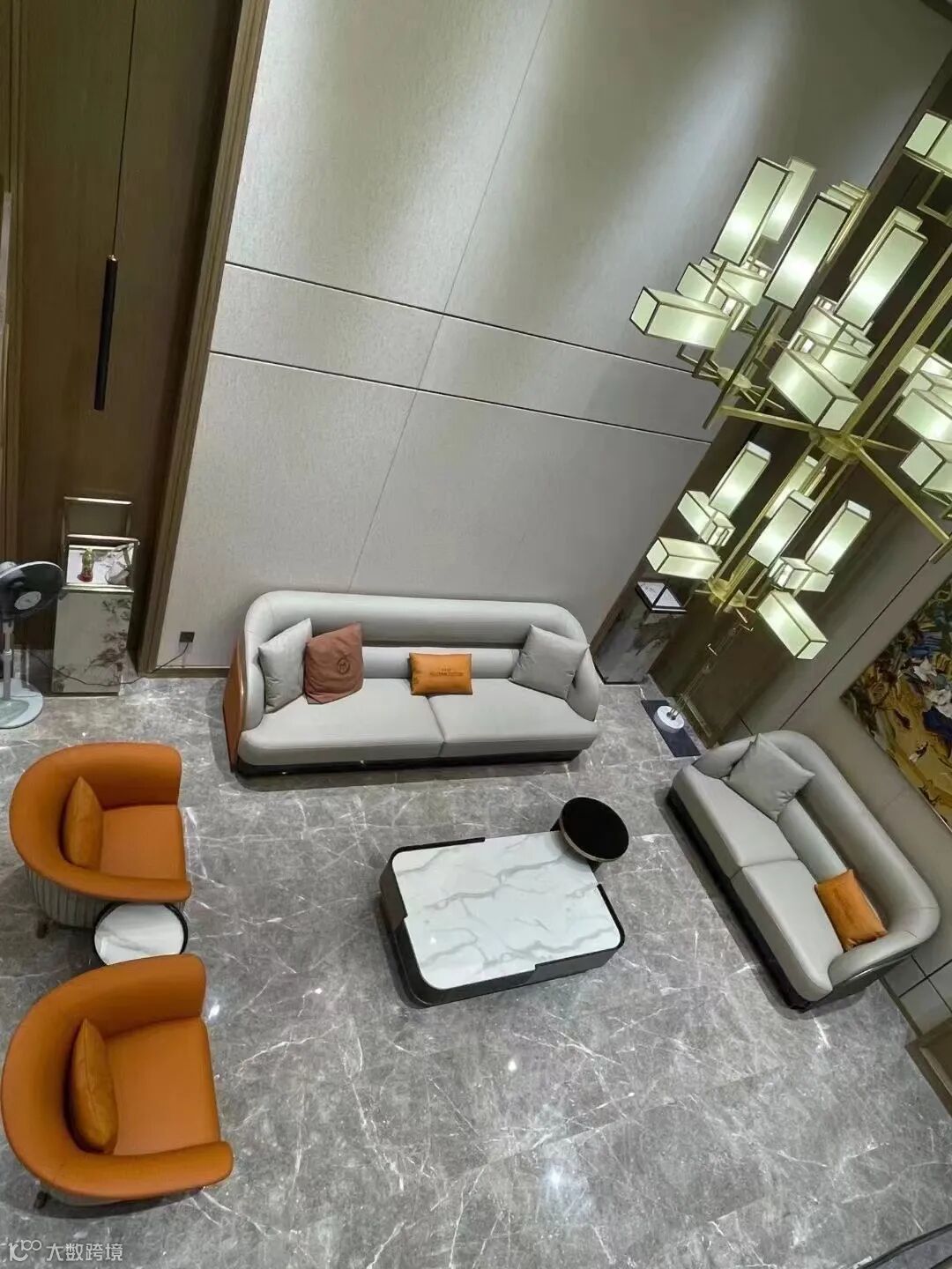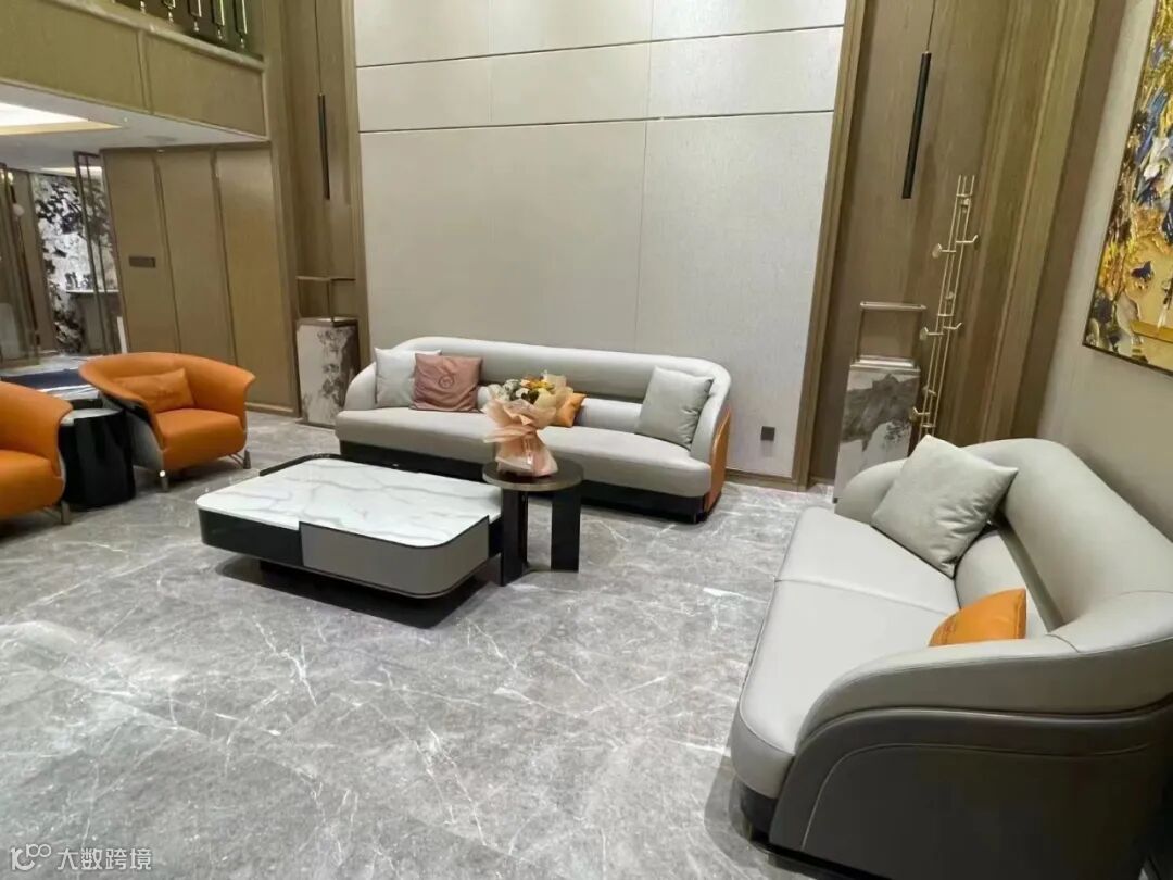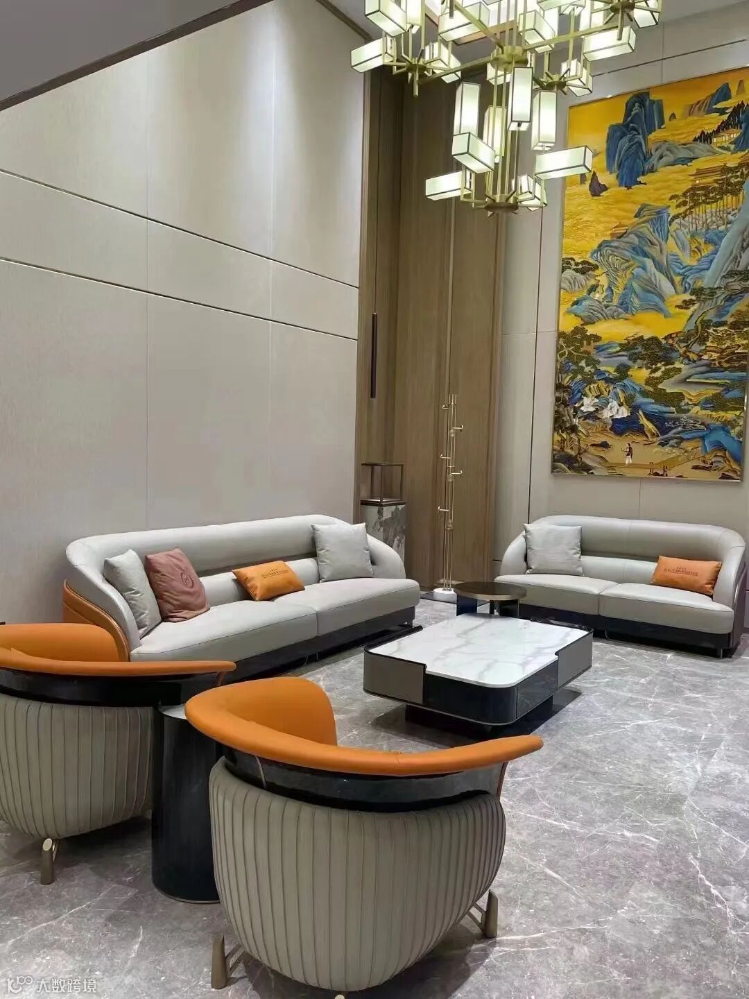 客厅空间呈现出典型的意式轻奢元素,Mucham Vuitton意大利原创游艇沙发,珍珠白纳帕布+BV编织与精妙的工艺,彰显出其独特的艺术感,爱马仕橙休闲椅和抱枕作为点缀,细腻柔软的头层皮质与制作工艺,演绎出生活的质感。