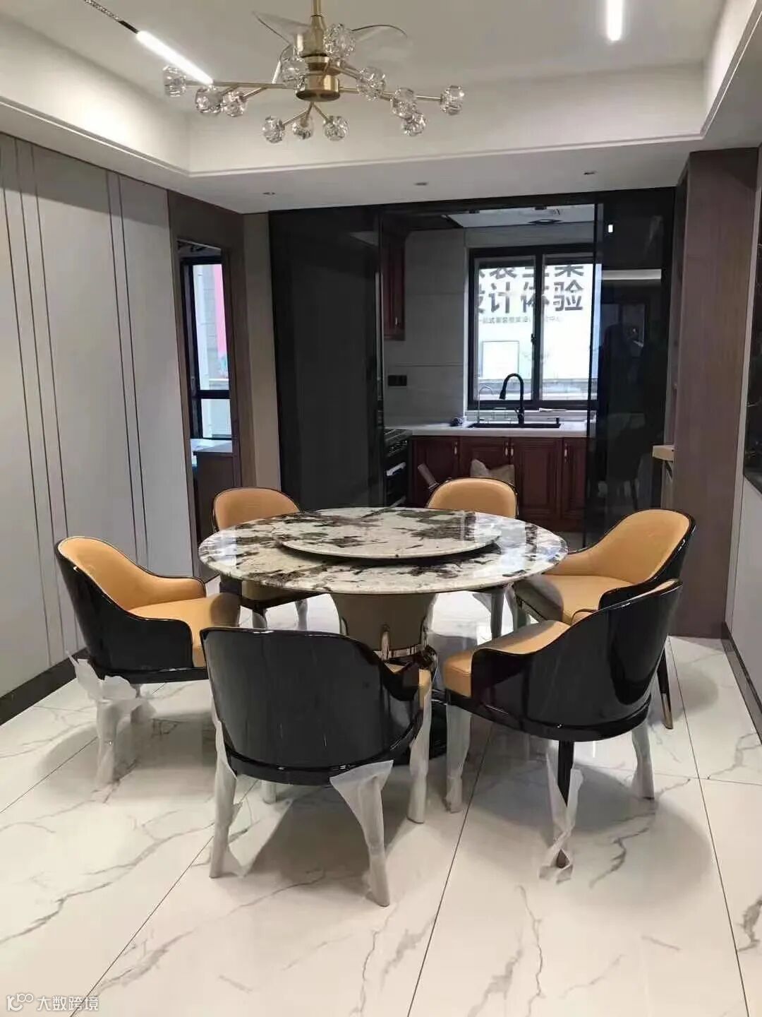 进口潘多拉石面,意大利进口牛皮软包餐椅,悬挂精巧的金色灯饰,点亮净白场域,舒适的用餐区,让人怀抱清爽愉悦的心情,享受餐点,以及和家人共聚的时光。