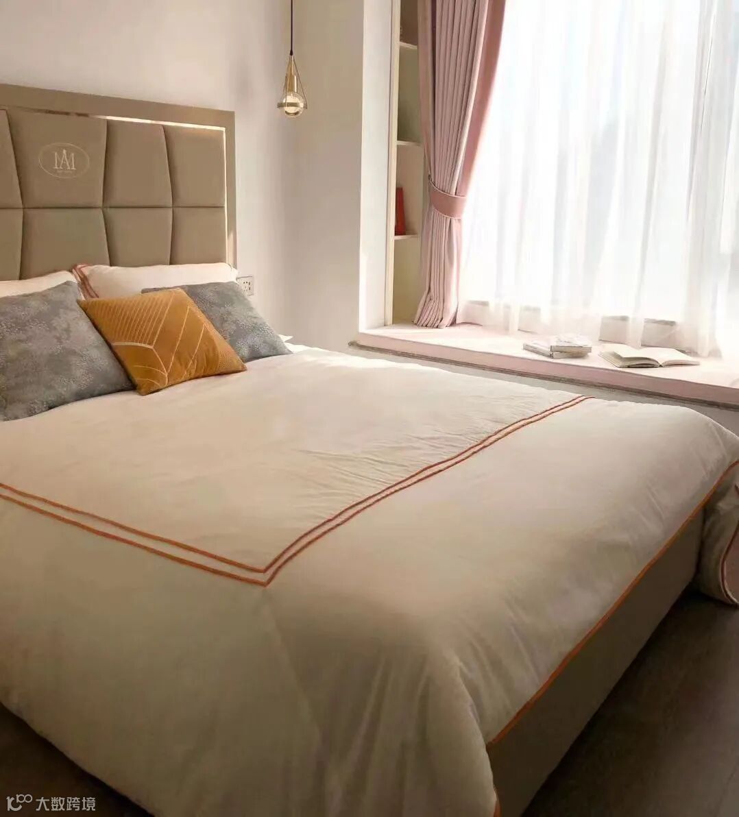 走进次卧,一片透亮舒心的景色,粉红色的窗帘,AM轻奢软包床,设计独特的床头吊灯,予人平和心境,最终于白色寝具的安稳包裹下,拥有一夜好眠。