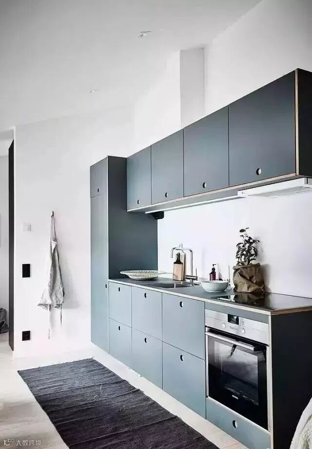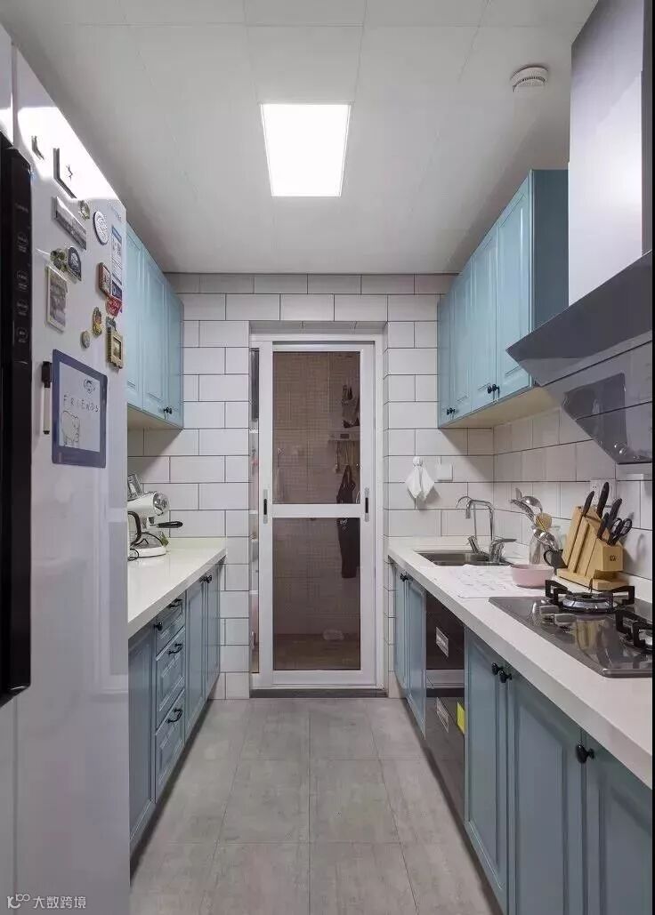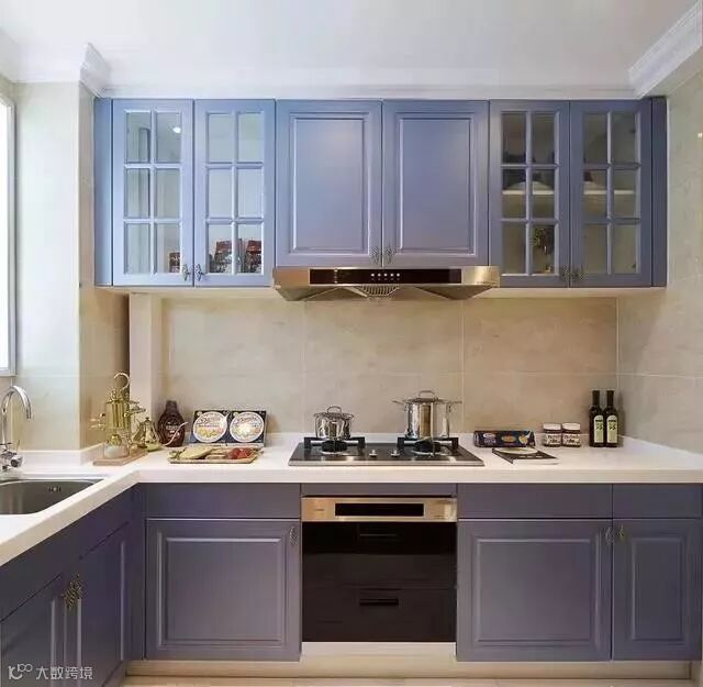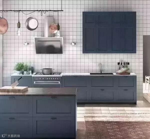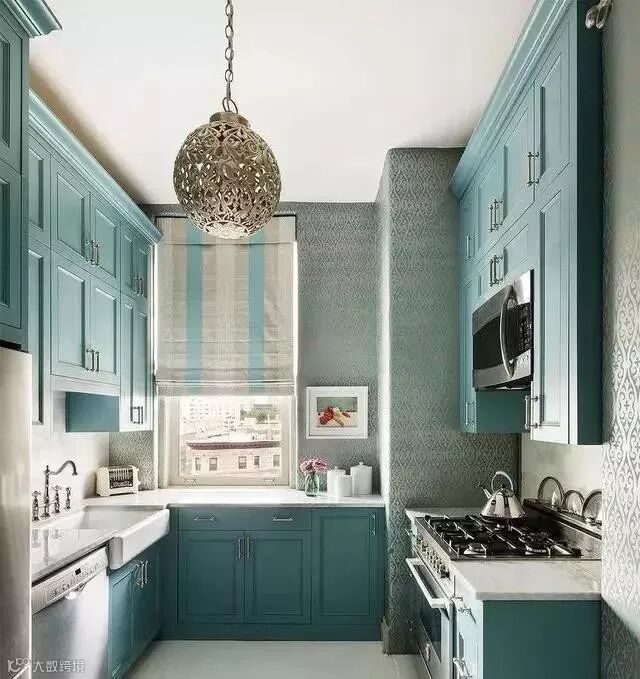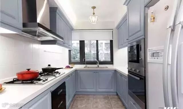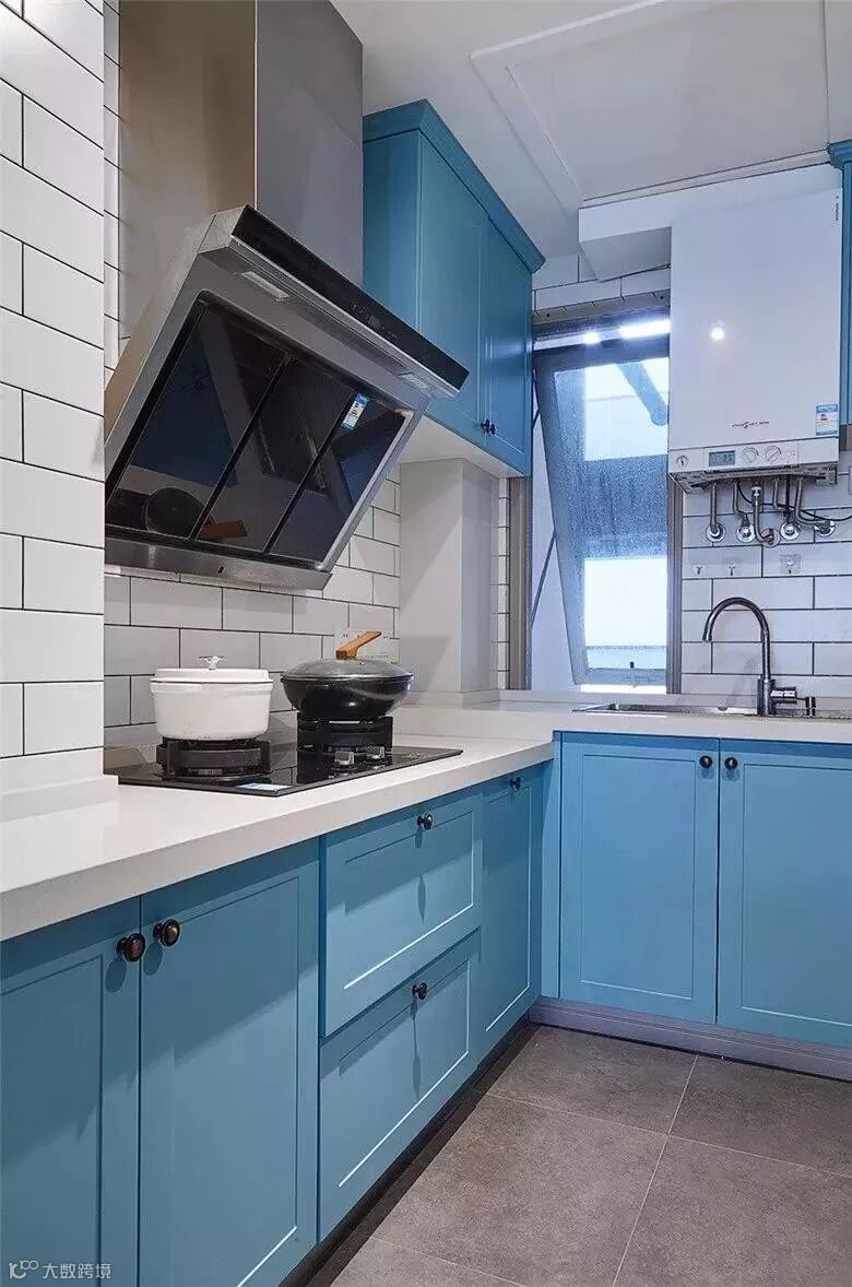 蓝色系橱柜给人一种清凉的感觉。你可以用简约的软装装饰效果,呈现一个时尚个性的厨房。