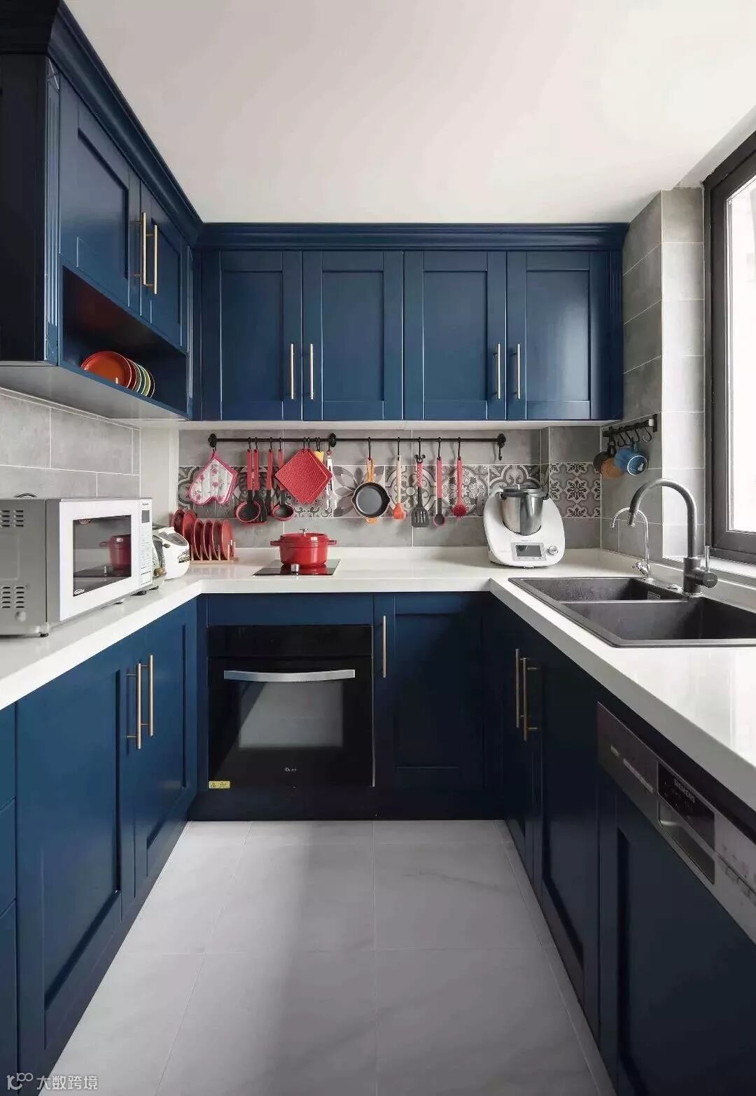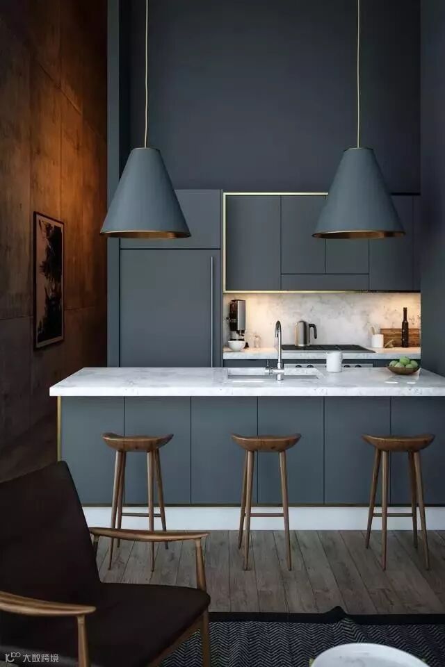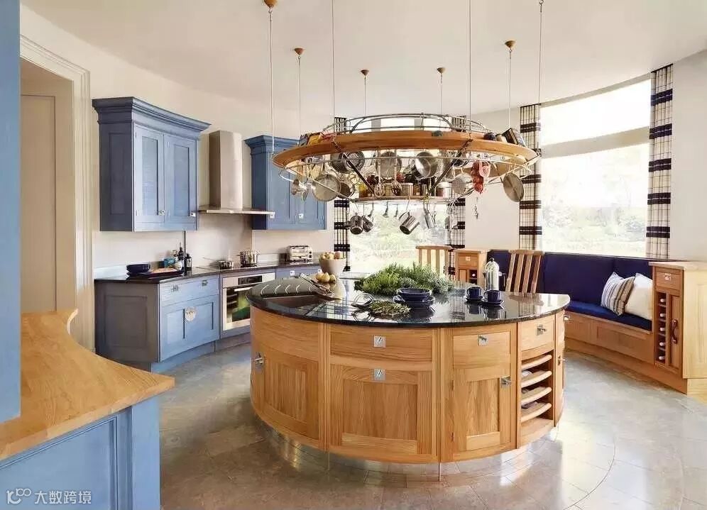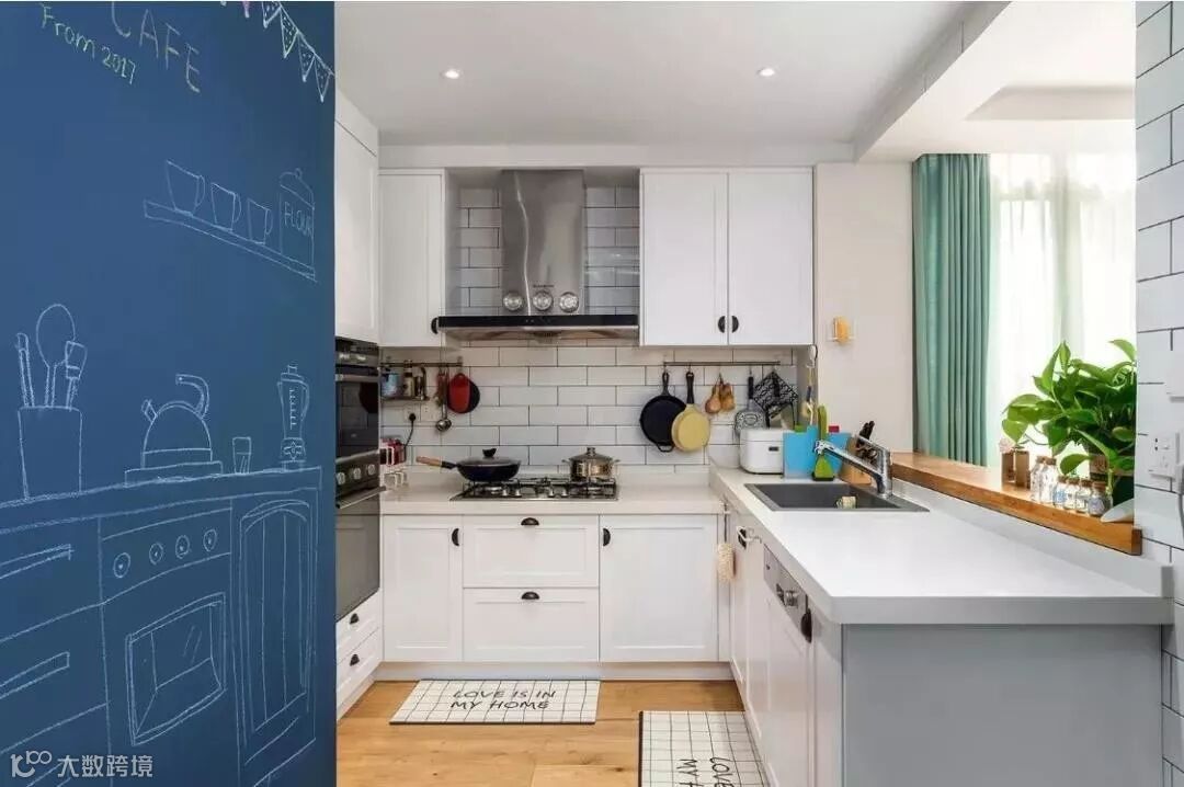 蓝色系橱柜给人一种清凉的感觉。你可以用简约的软装装饰效果,呈现一个时尚个性的厨房。