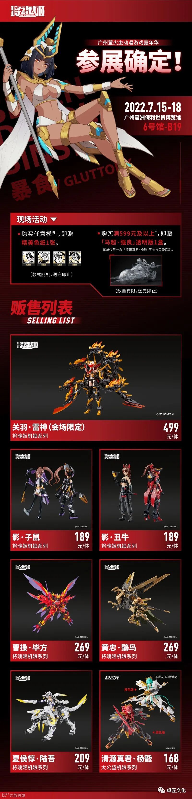 会场上将会展出多款产品,以及各种人气商品的贩售,包括刚出货的「影系列·子鼠机娘」。同时现场准备了优惠活动,消费满一定金额,即赠「马超·强良」透明版,期待大家光临!