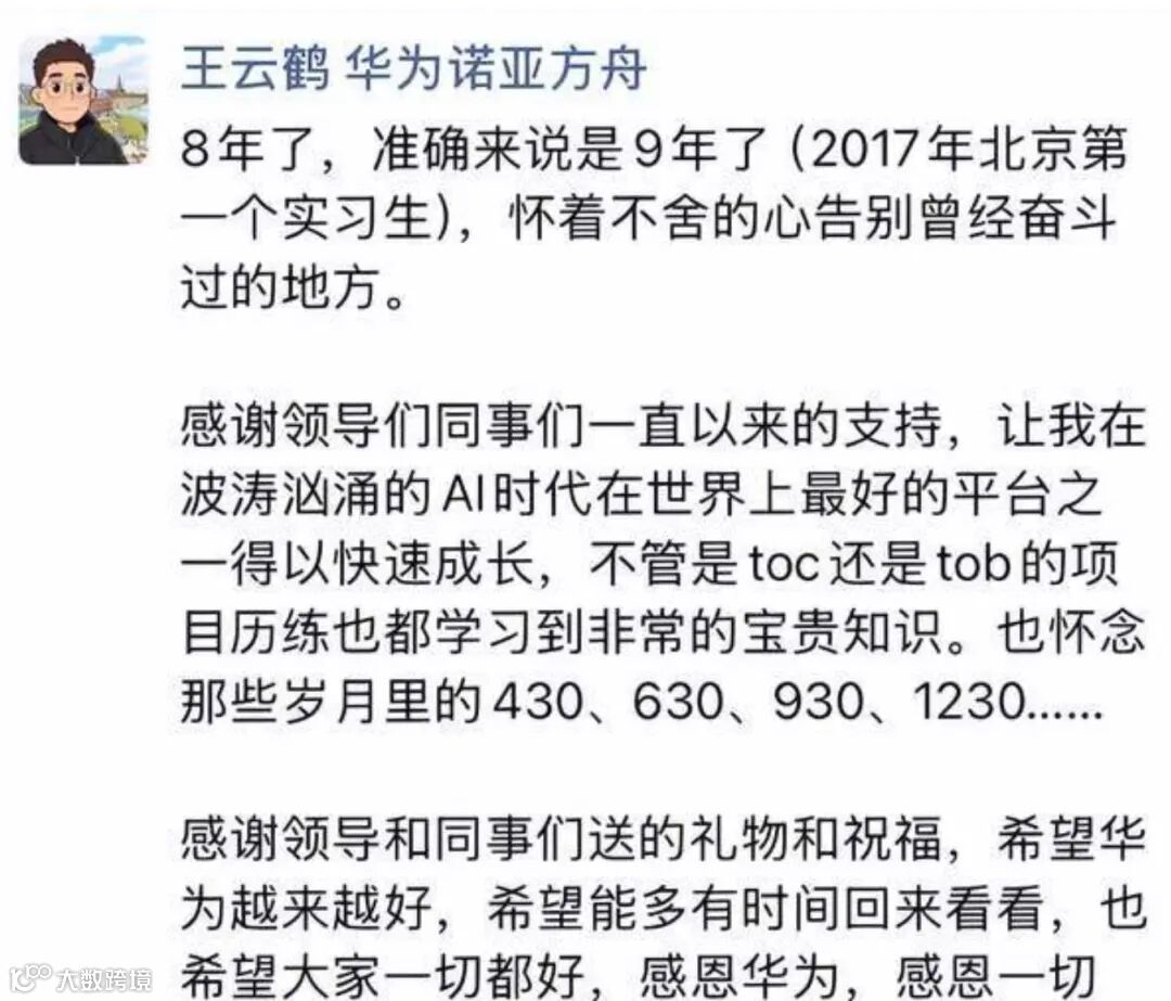 华为盘古大模型负责人、诺亚方舟实验室主任王云鹤正式离职。其在社交媒体发文表示,自2017年作为北京首位实习生加入华为,至今近九年时光,将告别"430、630、930、1230"等共同奋斗时刻。王云鹤1991年生,北大智能科学博士,Google学术引用量超3.3万,CCF-A类论文70余篇。代表作GhostNet成为业界轻量级端侧模型参考,AdderNet因替代AI芯片乘法运算入选华为"十大发明"。