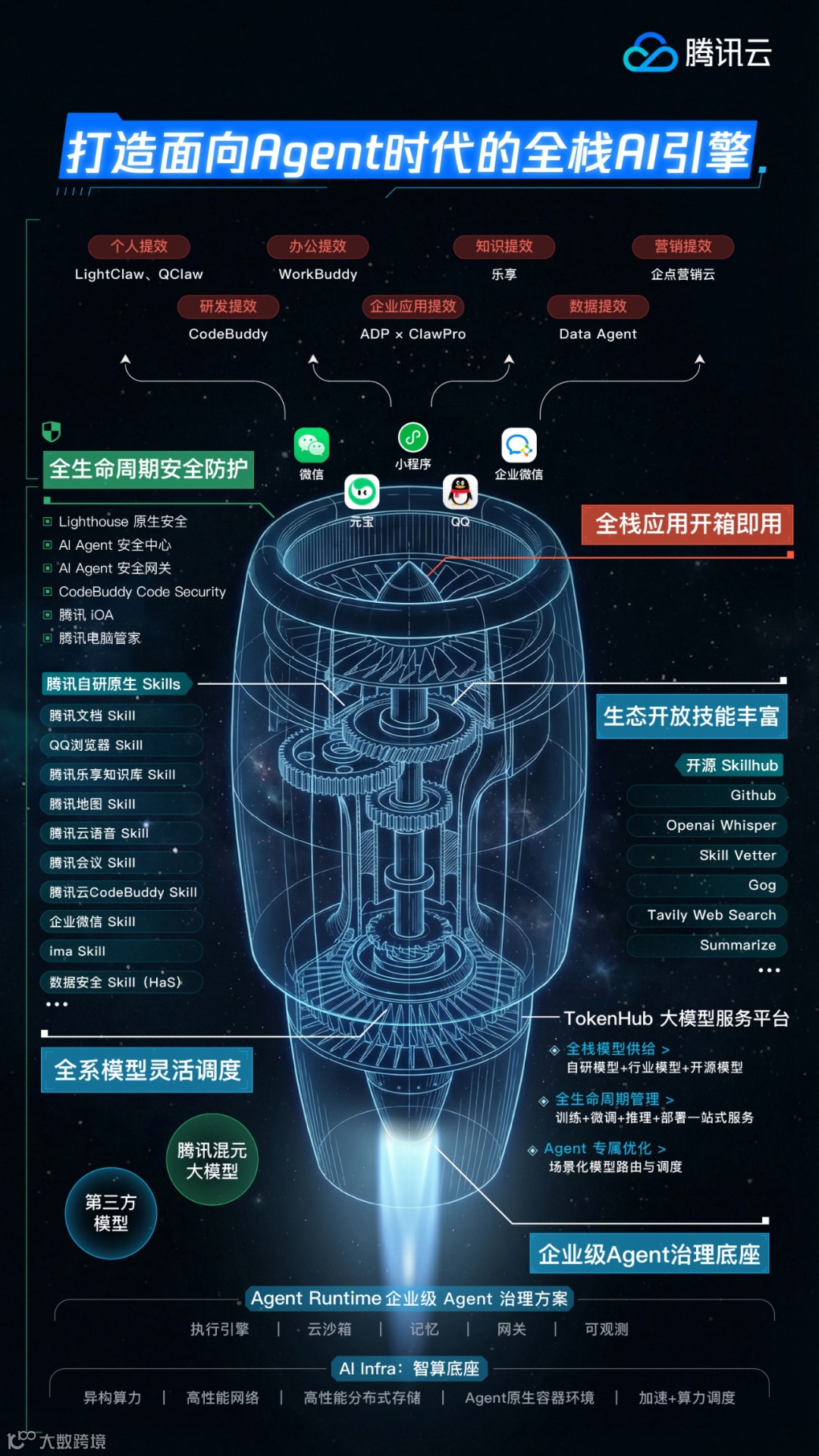 模型(大脑):TokenHub大模型服务平台调度混元、DeepSeek等模型;
