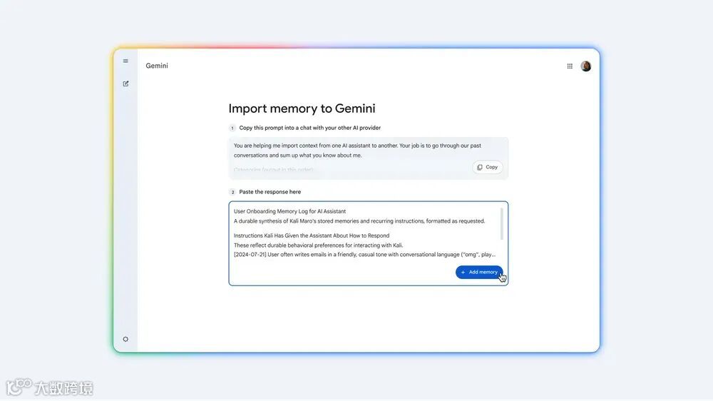 Gemini推出对话历史导入功能,用户可上传ChatGPT等AI的压缩聊天文件迁移使用习惯。Google提供预设提示词,引导用户提取个人信息、兴趣偏好等上下文数据,帮助Gemini快速建立个性化服务,降低平台迁移壁垒。