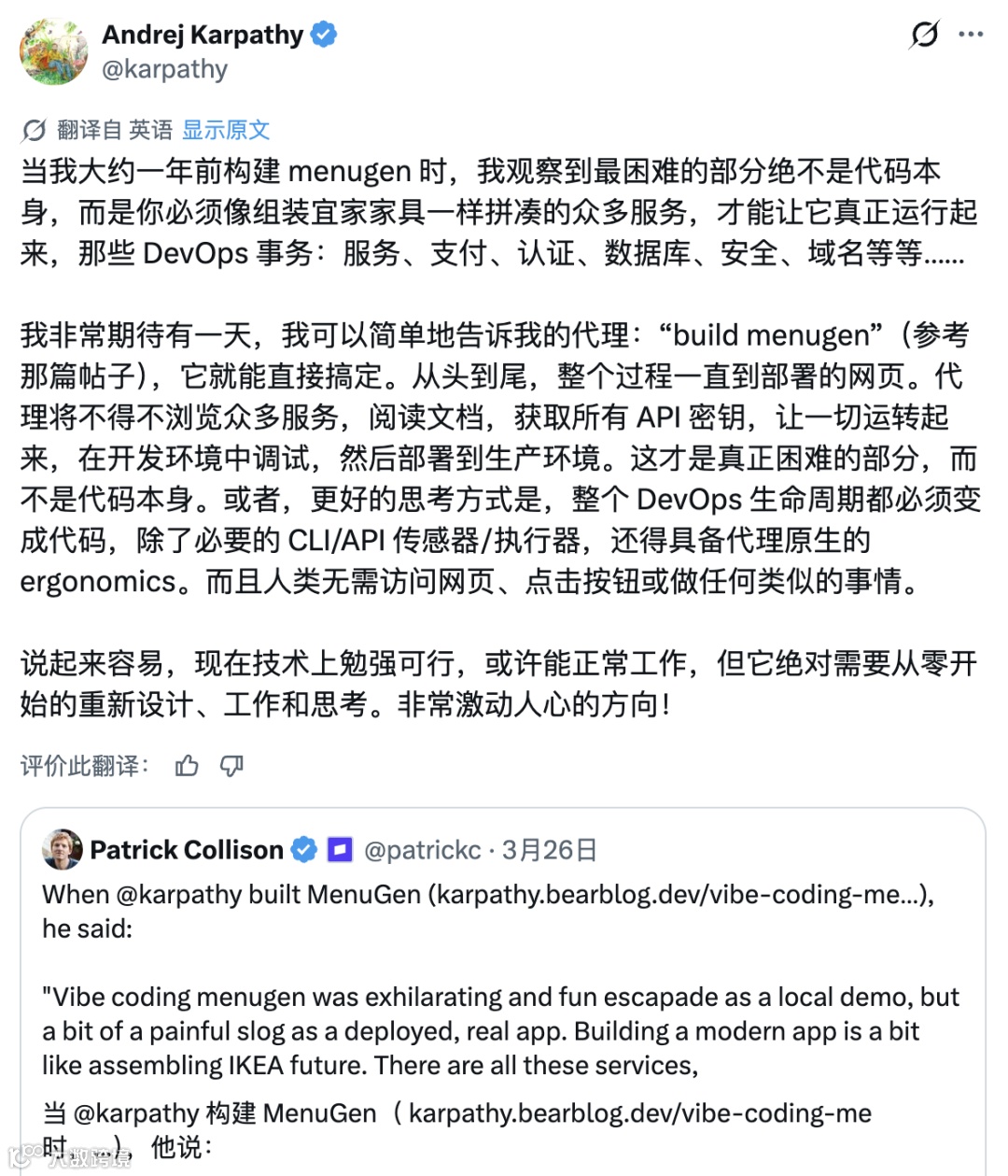 Andrej Karpathy指出,AI Agent真正价值在于解决部署难题。以餐厅菜单生成工具menugen为例,难点非代码编写,而在于集成支付、身份验证、数据库等基建。期待未来Agent能自主获取API密钥、调试并部署产品,实现全流程无需人工干预的DevOps自动化。