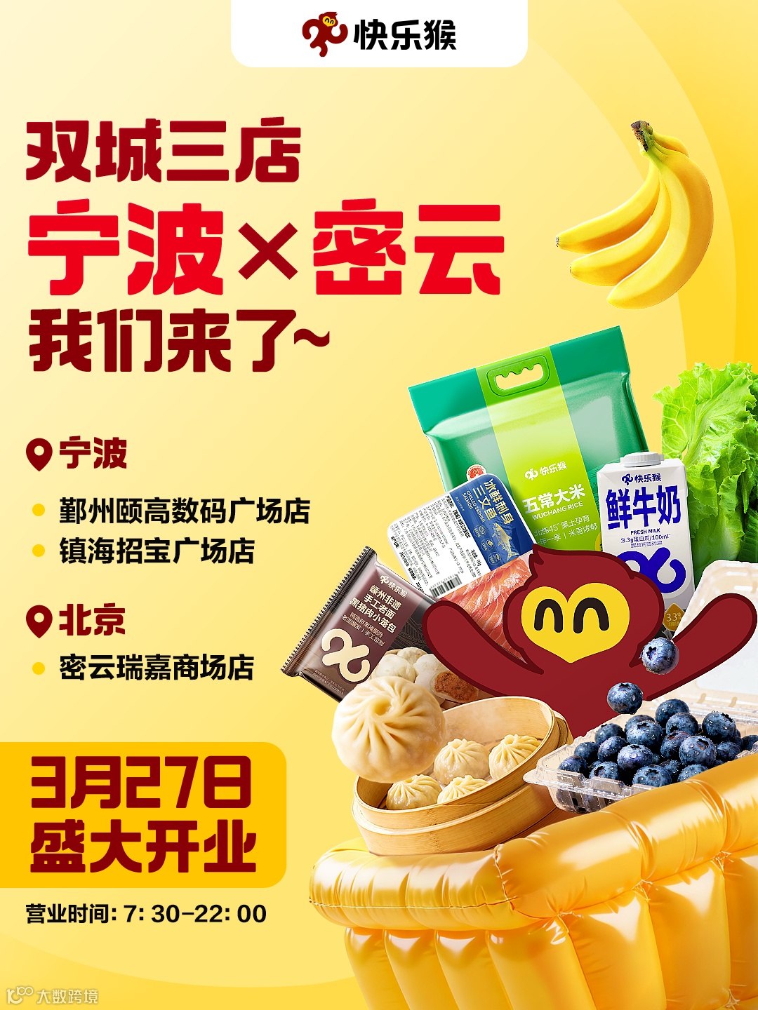 3月27日,快乐猴超市同时开设三家新店,正式进驻宁波市场并在北京新增门店,分别落地于浙江省宁波市鄞州颐高数码广场、镇海招宝广场及北京市密云瑞嘉商场。至此其运营门店总数达16家。