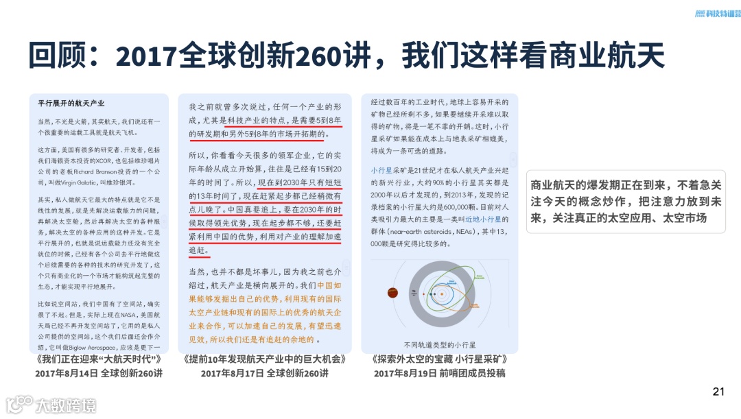 2017年王煜全提出关键论断:航天产业爆发需火箭发射、太空运营与商业应用"平行展开",而非单一技术突破。科技产业成熟需5-8年研发期叠加5-8年市场开拓期,预计2030年方迎爆发拐点。
