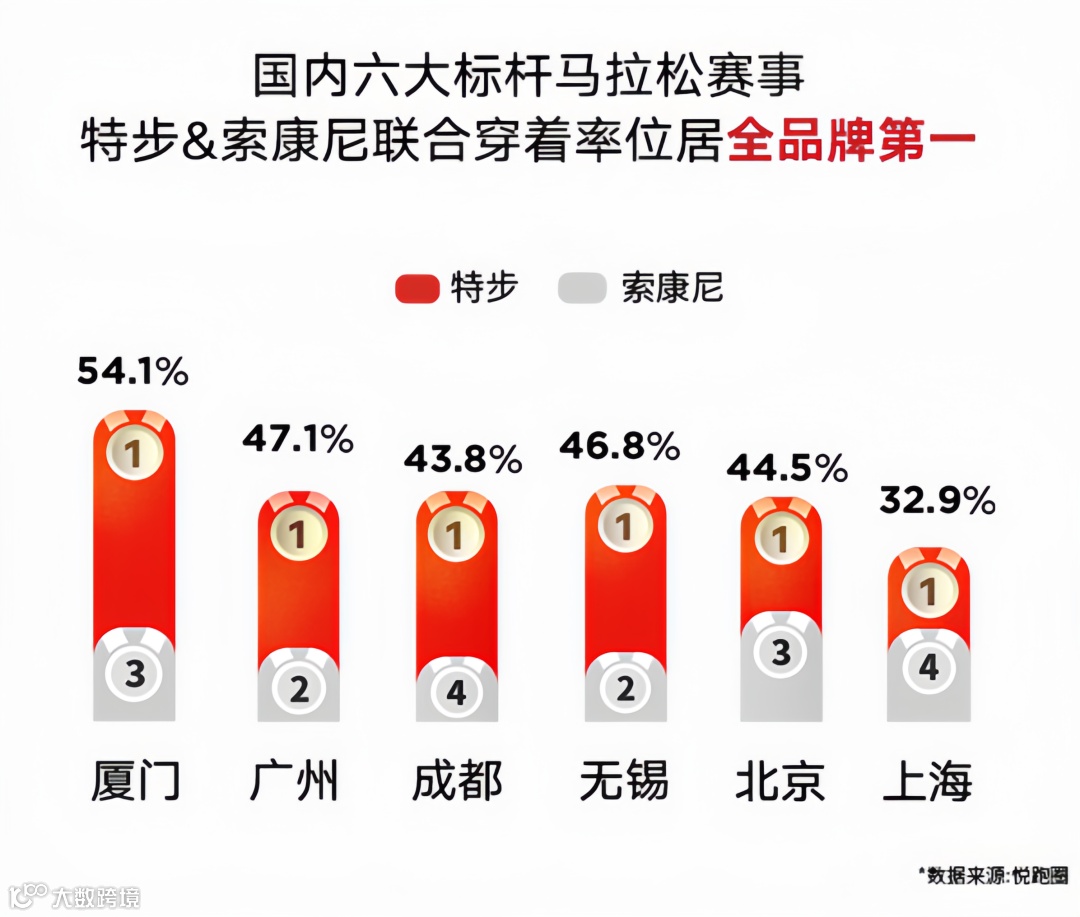 在国内头部马拉松赛事中,特步跑鞋穿着率持续位居国产品牌第一。与此同时,通过“特跑族”平台与遍布全国的71家跑步俱乐部,品牌已连接了超过250万跑者。
