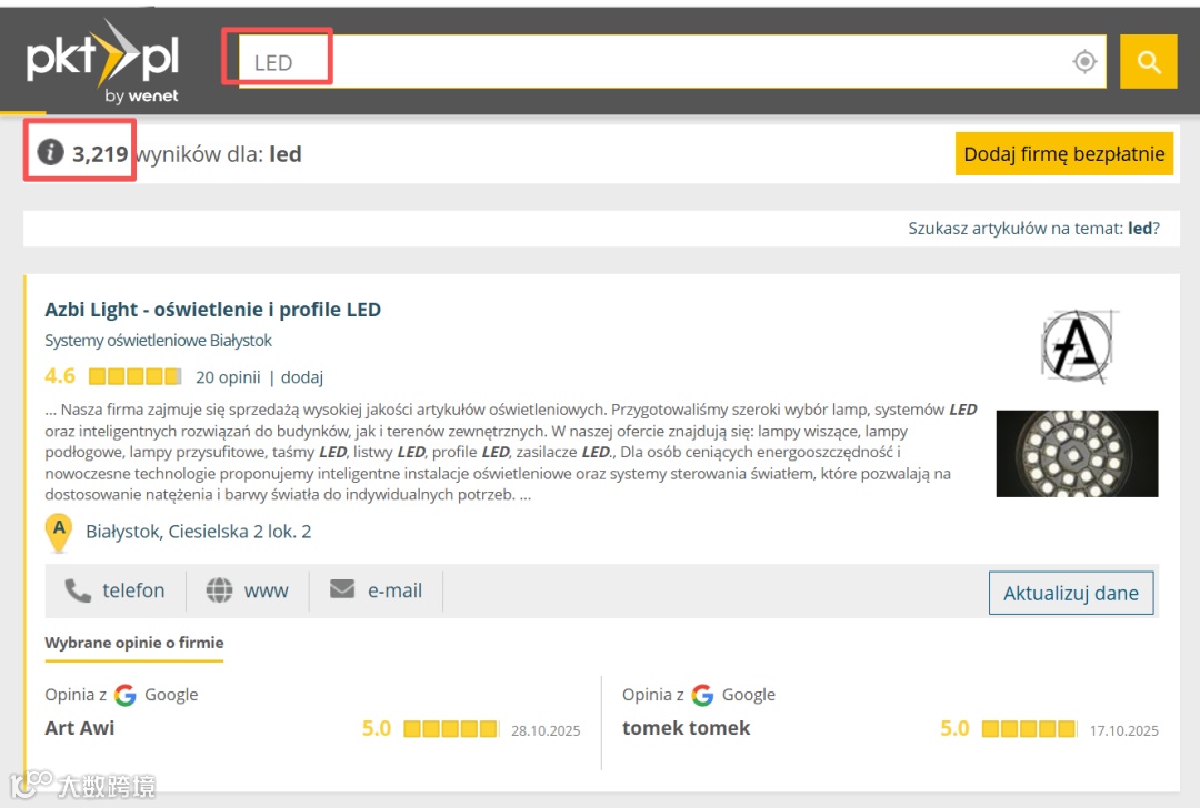 网址:https://www.pkt.pl/,该平台提供详尽的波兰企业数据库,支持行业或产品关键词筛选。使用时需将搜索词转换为波兰语(如"LED"),系统可显示3200余家相关企业,并支持按条件过滤。