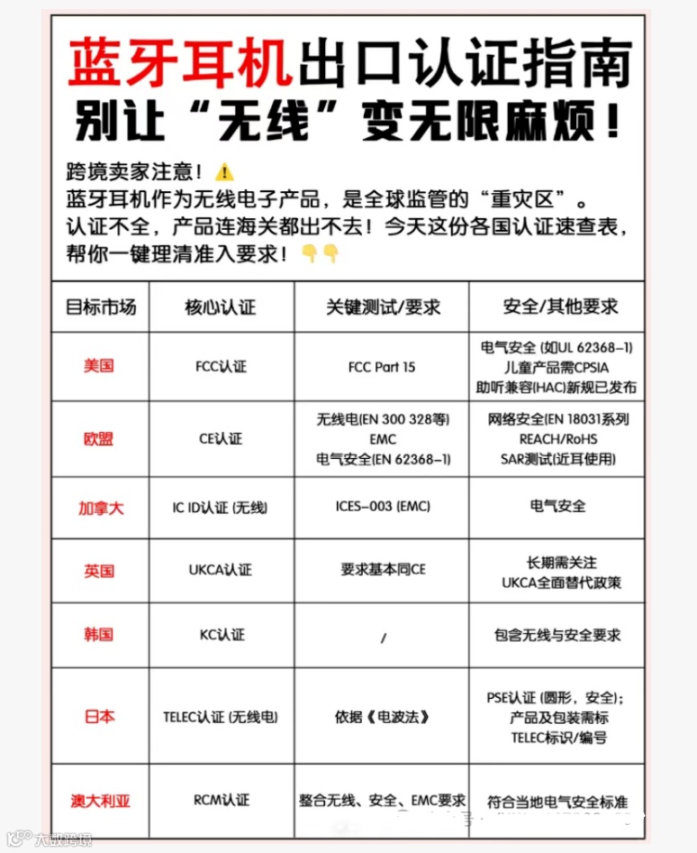 跨境卖家注意:蓝牙耳机作为无线电子产品,面临严格的全球监管。认证缺失将导致产品无法通过海关。