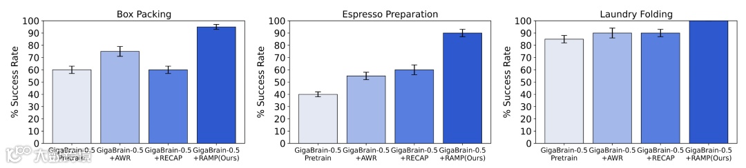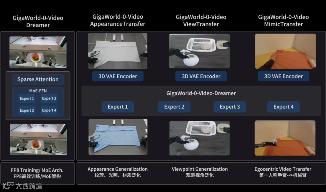 GigaWorld平台通过高保真合成数据生成,实现数据放大效应。测试表明,在新纹理、新视角、新物体位置三大泛化维度,VLA模型性能提升近300%,训练效率提高10-100倍。