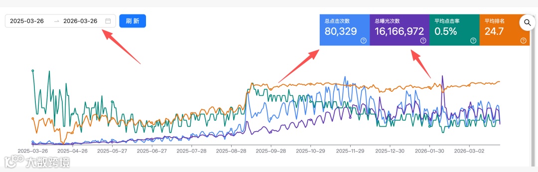 实现8万余次点击、1600万次曝光。前期流量积累期较长,验证SEO需持续投入,多数运营者止步前三月,该客户坚持突破瓶颈。