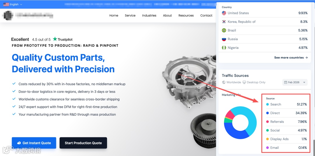 搜索流量占比51%,印证SEO作为核心来源的稳定性与可持续性。