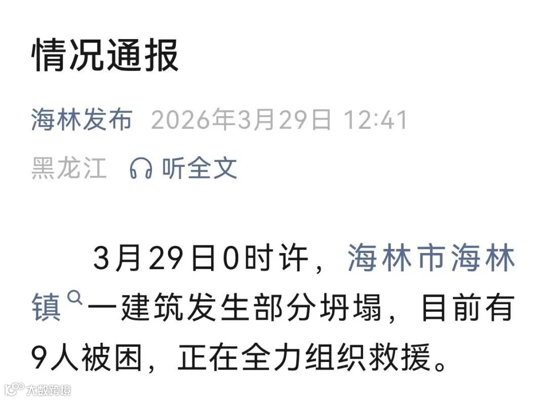 另据新京报,黑龙江牡丹江市海林市林海路一建筑发生垮塌,当地消防、急救、住建等多部门连夜组织人员到场进行救援。