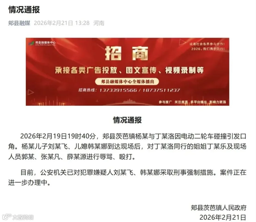 据郏县融媒2月21日消息:2026年2月19日19时40分,郏县茨芭镇杨某与丁某洛因电动二轮车碰撞引发口角。杨某儿子刘某飞、儿媳韩某娜到达现场后,对丁某洛同行的姐姐丁某乐及现场人员郭某、张某凡、薛某源进行辱骂、殴打。